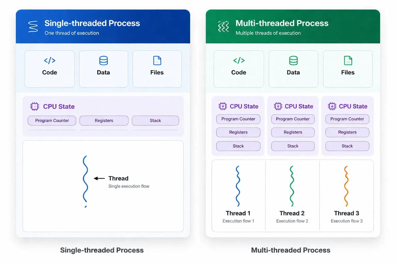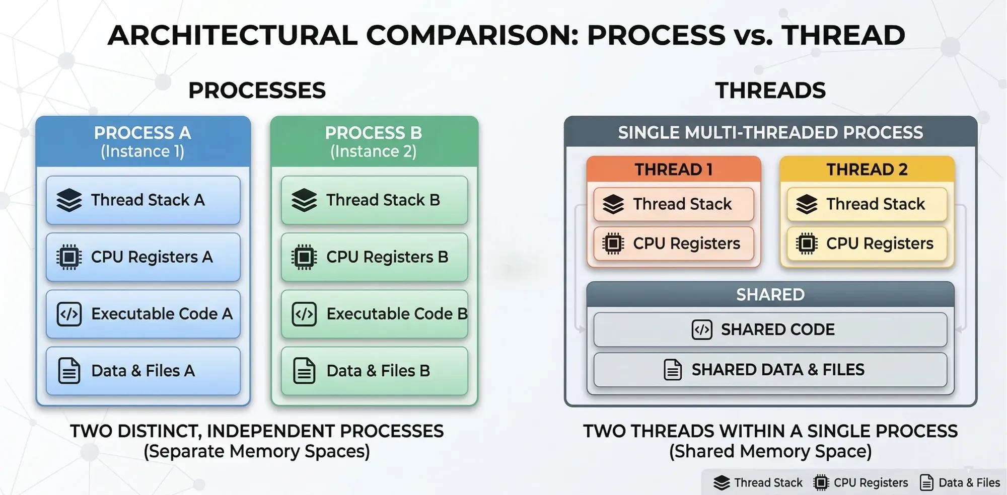 The difference between processes and threads is often confusing, but it becomes clear when you focus on how they operate. A process is heavy and requires its own memory space and resources. Creating a process takes time because the operating system must allocate memory and set up structures.